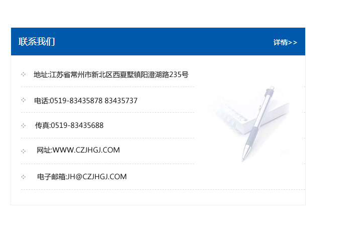 地址:常州市新北區(qū)友邦商務(wù)大廈1幢16、17層  電話(huà):0519-85101652  傳真:0519-85112595  郵編:213022  網(wǎng)址:www_cz-jiayue_cn.bjzrsf.com  郵箱:xiajifengaa@163.com